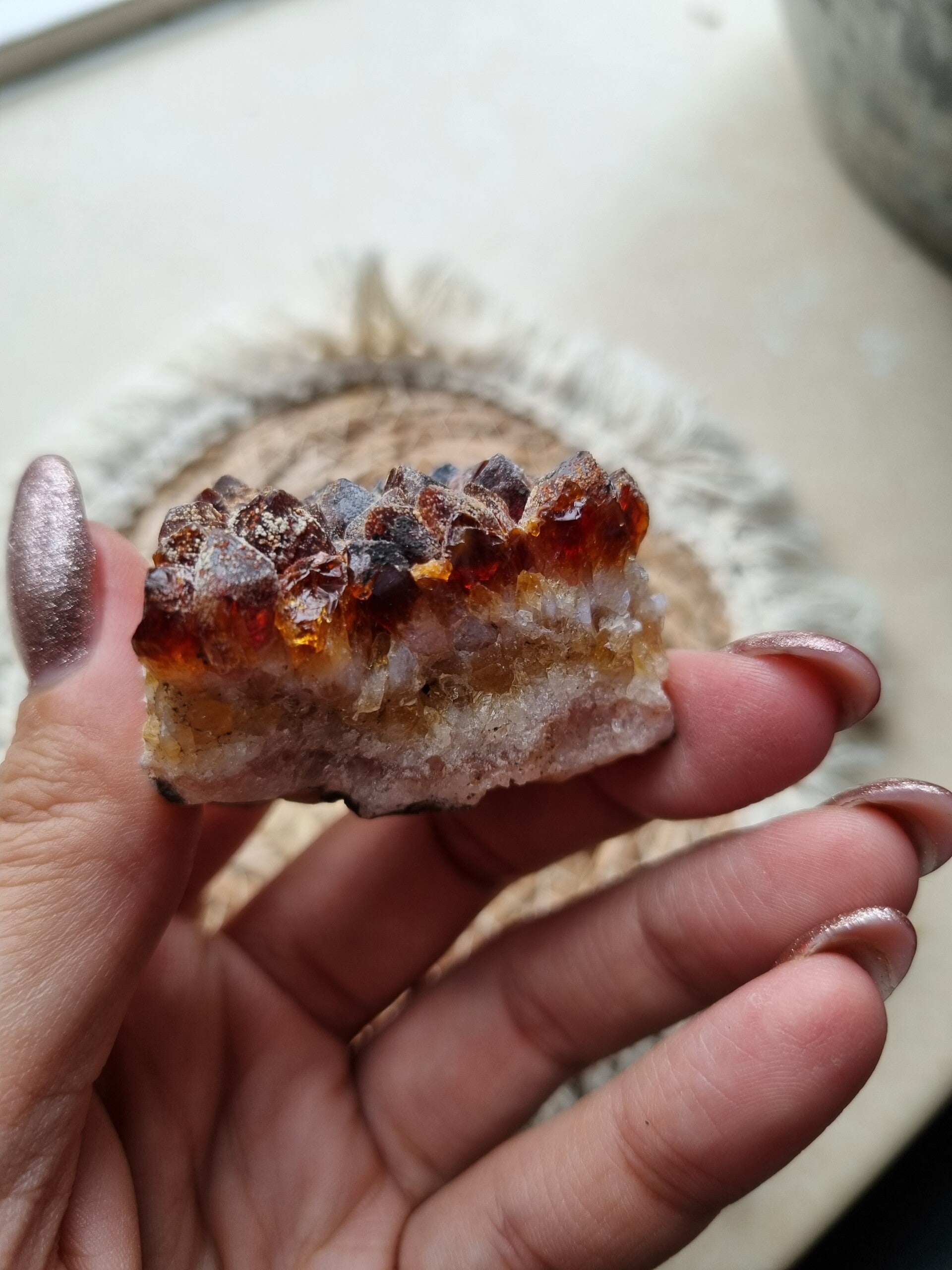Deze steen brengt ontspanning en geeft een zonnig gevoel. Helpt je moeilijkheden overwinnen, geeft je energie en bevordert de bloedcirculatie. Gebrande amethist helpt ook bij de ontwikkeling van jouw heldere vermogens en intuïtie.